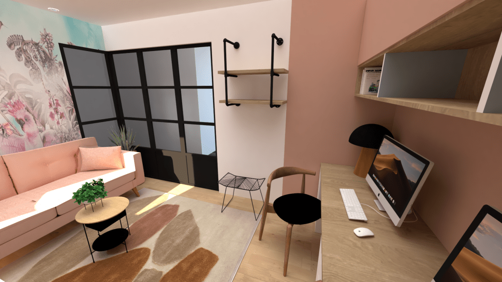 Agencement et décoration de plusieurs pièces d’une maison neuve, en construction : bureau/chambre d’amis, séjour, cuisine.